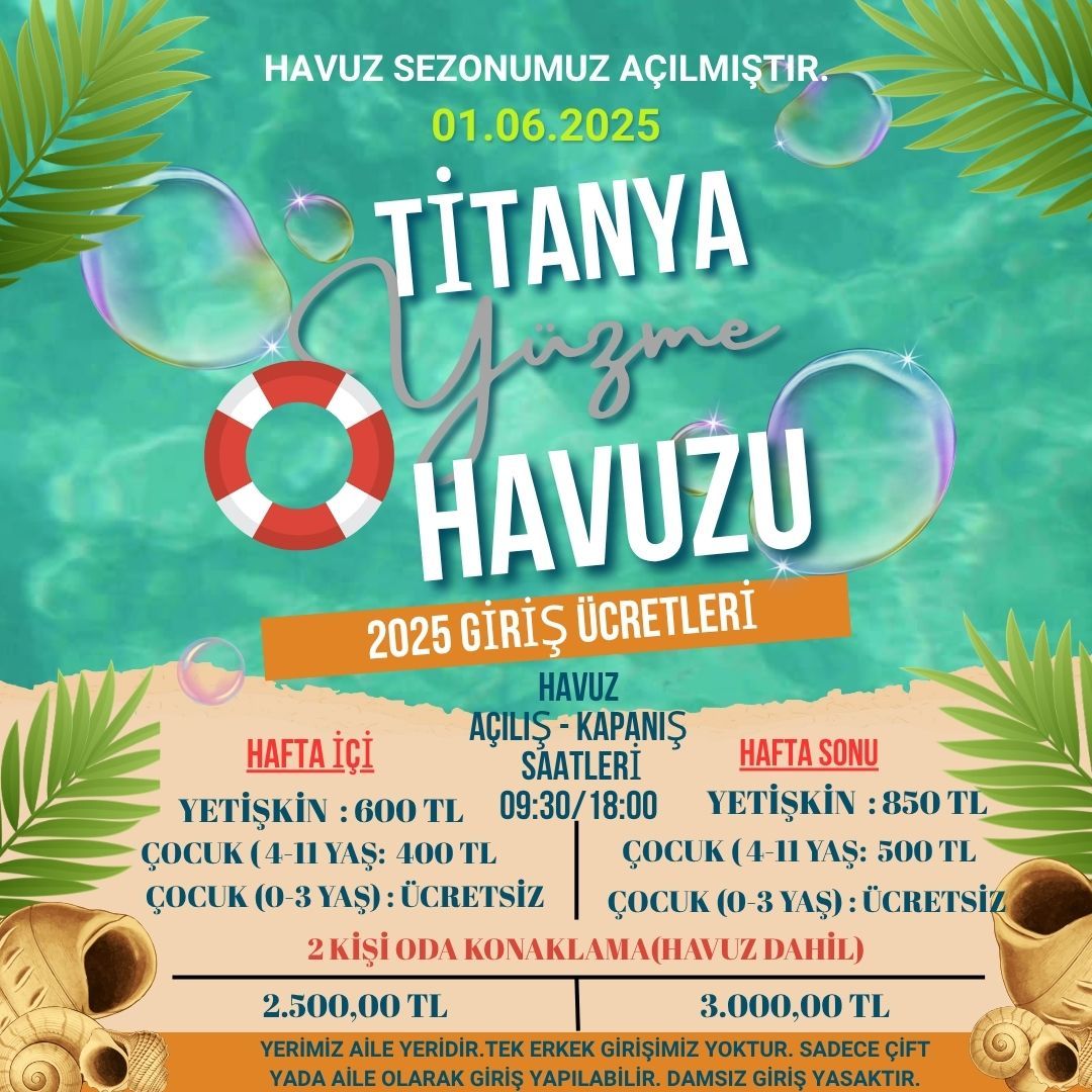 Yazın sıcağını keyifle geçirebileceğiniz bu aktiviteden ister günlük ister gecelik olarak faydalanabilirsiniz. 11 oda kapasitesine sahip Titanya, yüzme havuzu, organizasyon(event) ve konaklama işletmesi olarak faaliyet göstermektedir. Havuzlarımızın genişlik ölçüleri 22,5m x 12,5m olarak 2 adet havuzumuz bulunmaktadır. Havuzlarımızın derinlik ölçüleri ise; 180cm'den başlayarak 240cm'e kadar derinleşmektedir, diğer havuzumuz ise 70cm'den 120cm'e derinleşirken 120cm'lik derinliğe yükselen bölgeye birleşik 50cm'lik bebek havuzumuz bulunmaktadır.
